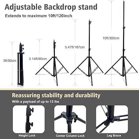 - Customizable to Meet Your Needs: Whether you’re capturing sweeping panoramas or intimate close-ups, our stand offers a range of adjustment options. Easily fine-tune height and width with maximum heights and widths reaching up to 10 feet, ensuring you achieve your desired shooting effects with ease.